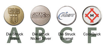 * Our enamel 3/4" ball markers are always priced as die struck hard enamel. Some designs require an additional silkscreen and epoxy dome. Add 5% to unit price and $30 (G) per silkscreen color.